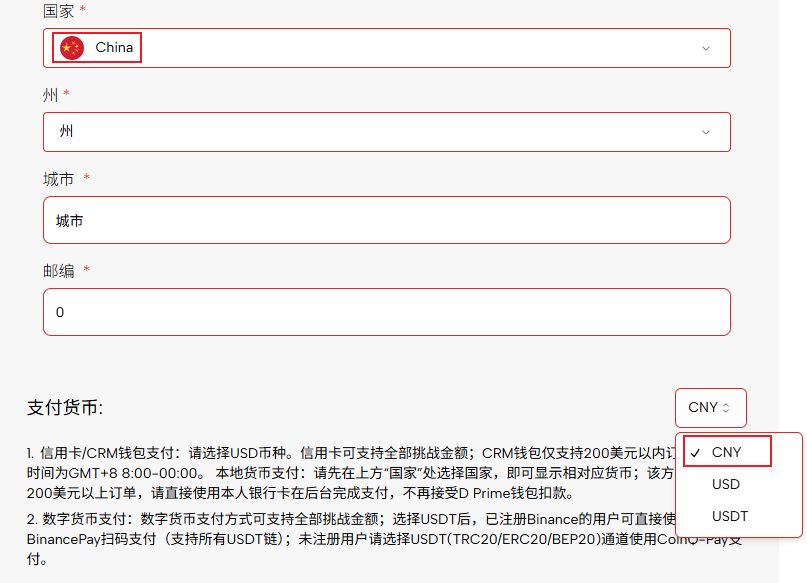 - في صفحة الدفع "أمة" حدد البلد وولاية العملة التي ترغب في الدفع بها عملة الدفع حدد العملة المقابلة من القائمة المنسدلة (على سبيل المثاليوان صيني).