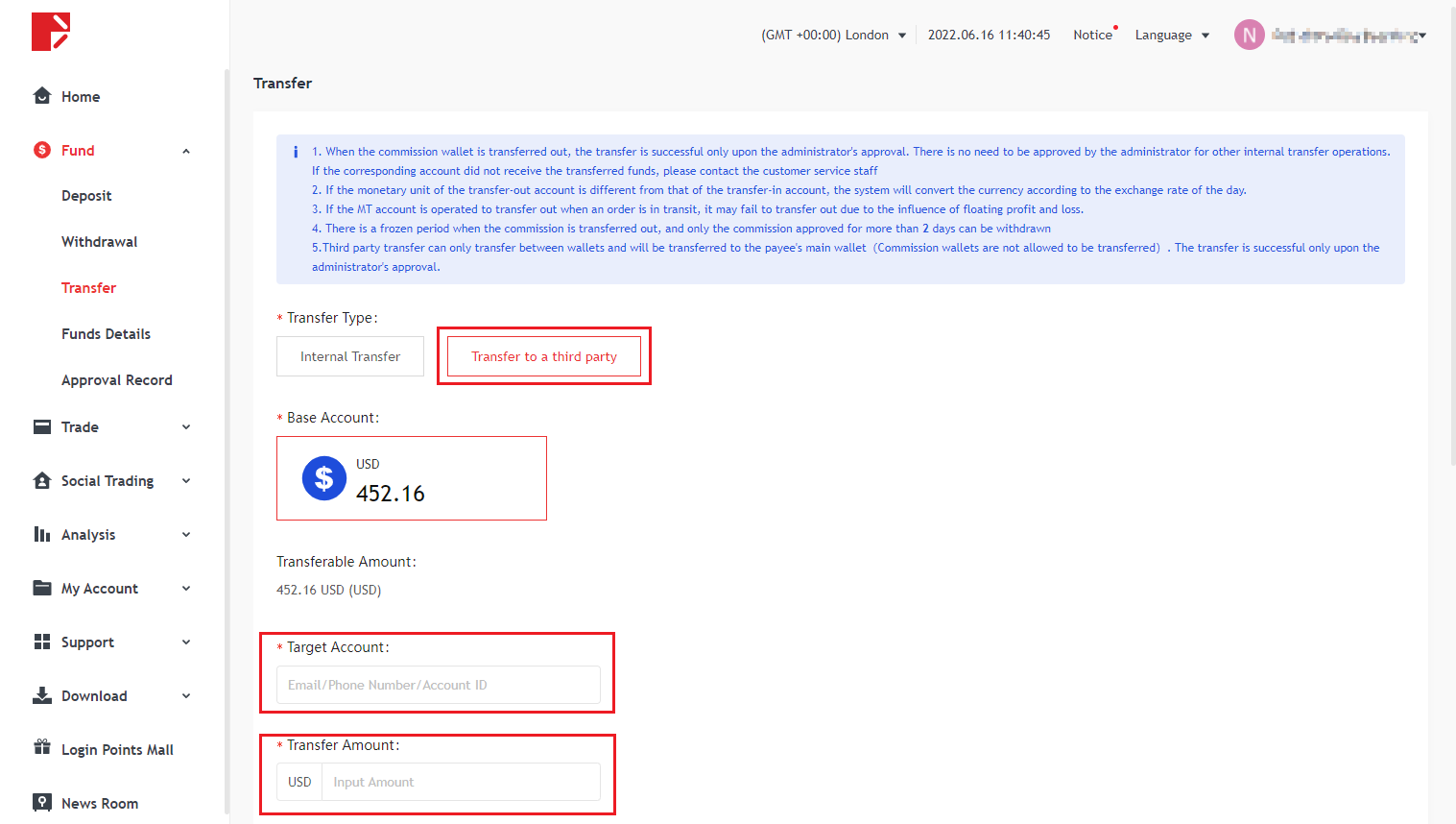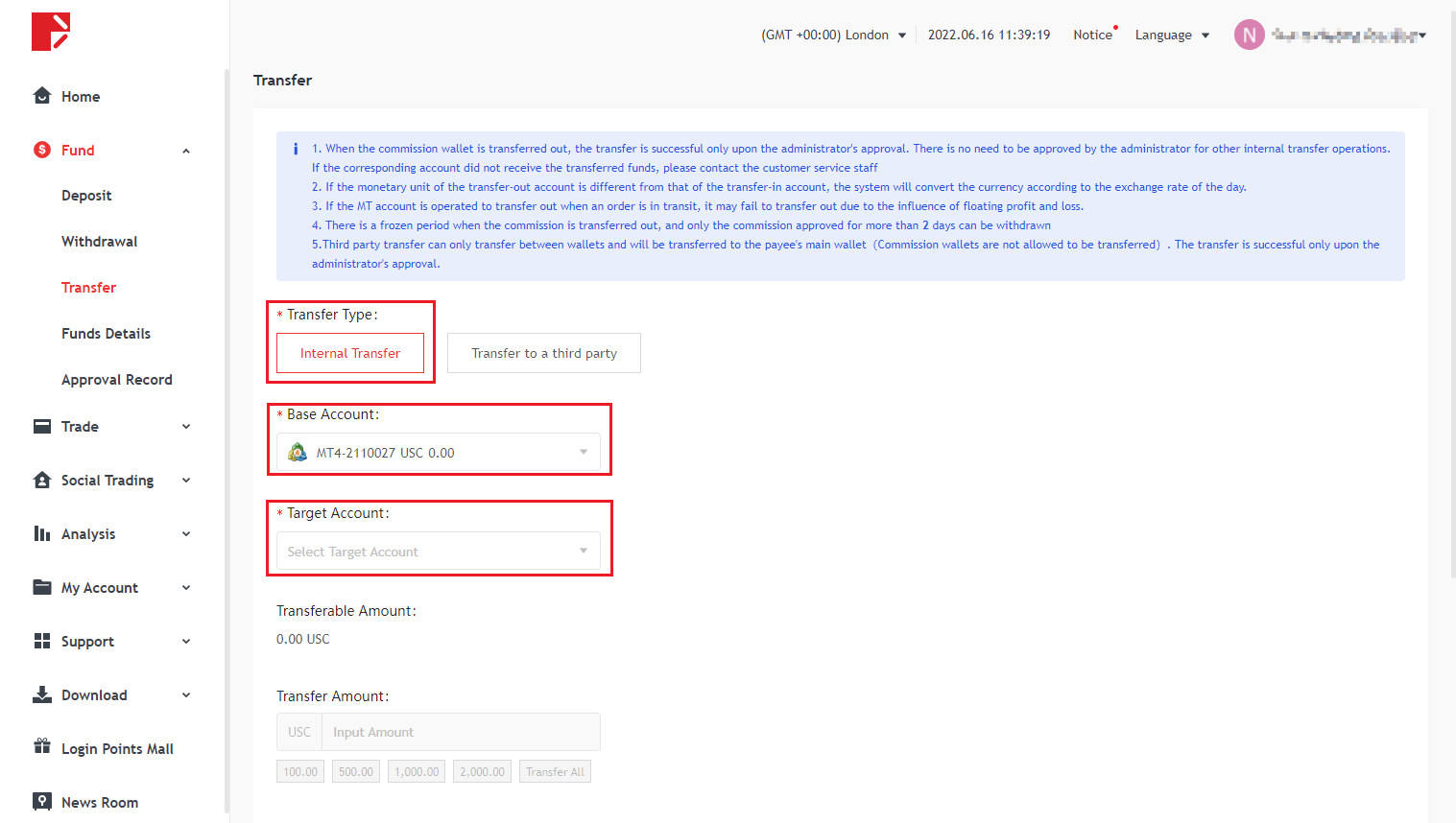 Select the transfer-out account and transfer-in account, enter the transfer amount, and click “Confirm Transfer”.