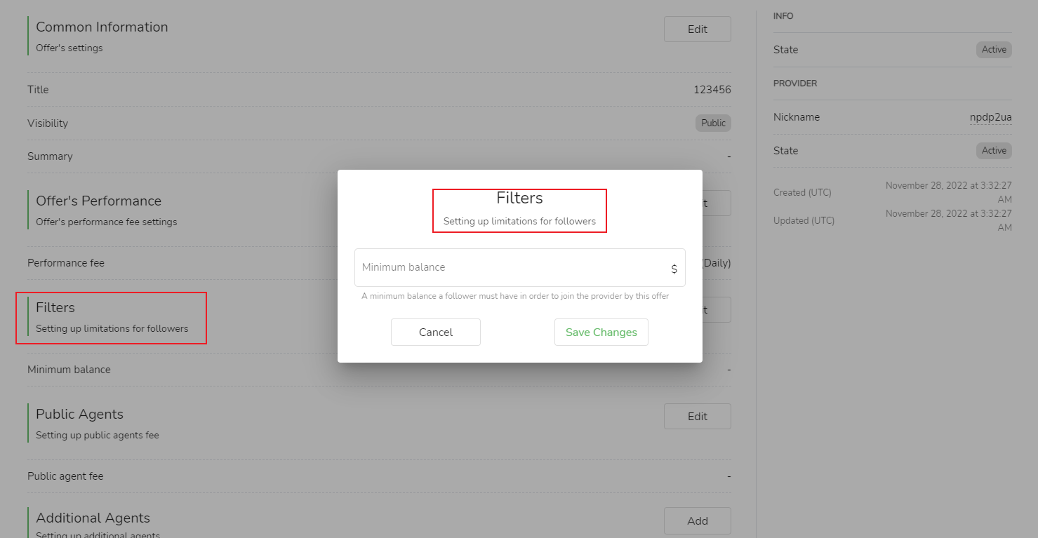 【Filters】: Copying threshold setting, set the minimum balance required to follow the signal source here.