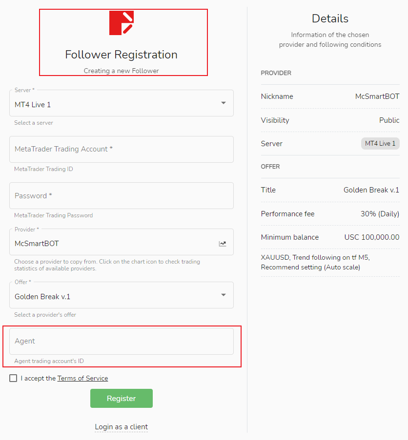 When the user registers as a follower, he only needs to enter the MetaTrader trading account of the introduction promotion on the registration page to add the introduction promoter.