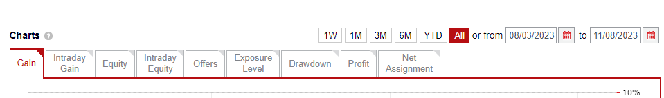 c. If the user wishes to create a quote or manage the settings of a Master account, please click on the desired Master account in the active accounts list for more details. The system will generate charts showing earnings, day's earnings, equity, quotes, exposure levels, maximum drawdowns, profits and net distributions for the selected Master account.