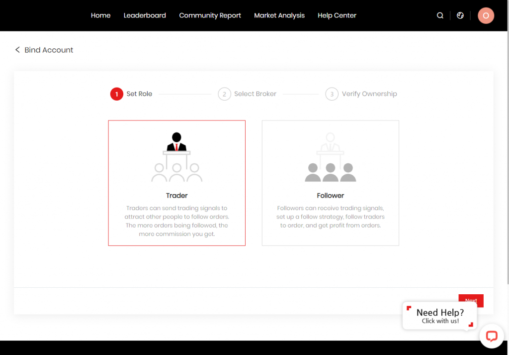 Inicie sesión en su Centro de usuarios de Doo Prime, haga clic en "Community Trading" en el lado izquierdo de la página de inicio, haga clic en "Outrade Account Management", haga clic en Add Account en el lado derecho de la página, seleccione el rol "Trader" o "Follower" , y finalmente vincular la cuenta que es Can.