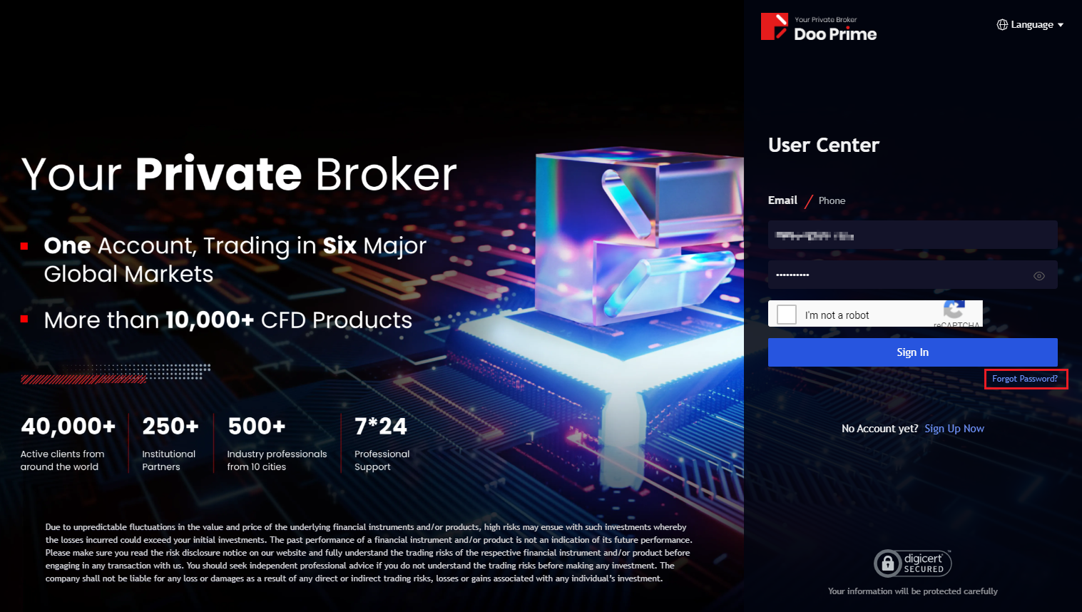D Prime 사용자 센터에서 실제 계정 비밀번호를 잊어버린 경우 어떻게 해야 하나요?