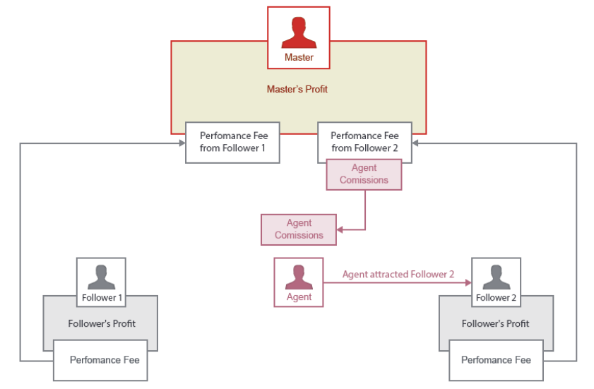 에이전시 수수료는 마스터 계정과 팔로어 사이에 이익이 분배될 때 거래 기간 종료 시 마스터 계정의 "성과 수수료"의 일정 비율이 에이전시 계정으로 이체되는 수수료를 의미합니다. 에이전트 커미션의 크기(백분율로 표시)는 마스터 계정에 의해 설정됩니다.