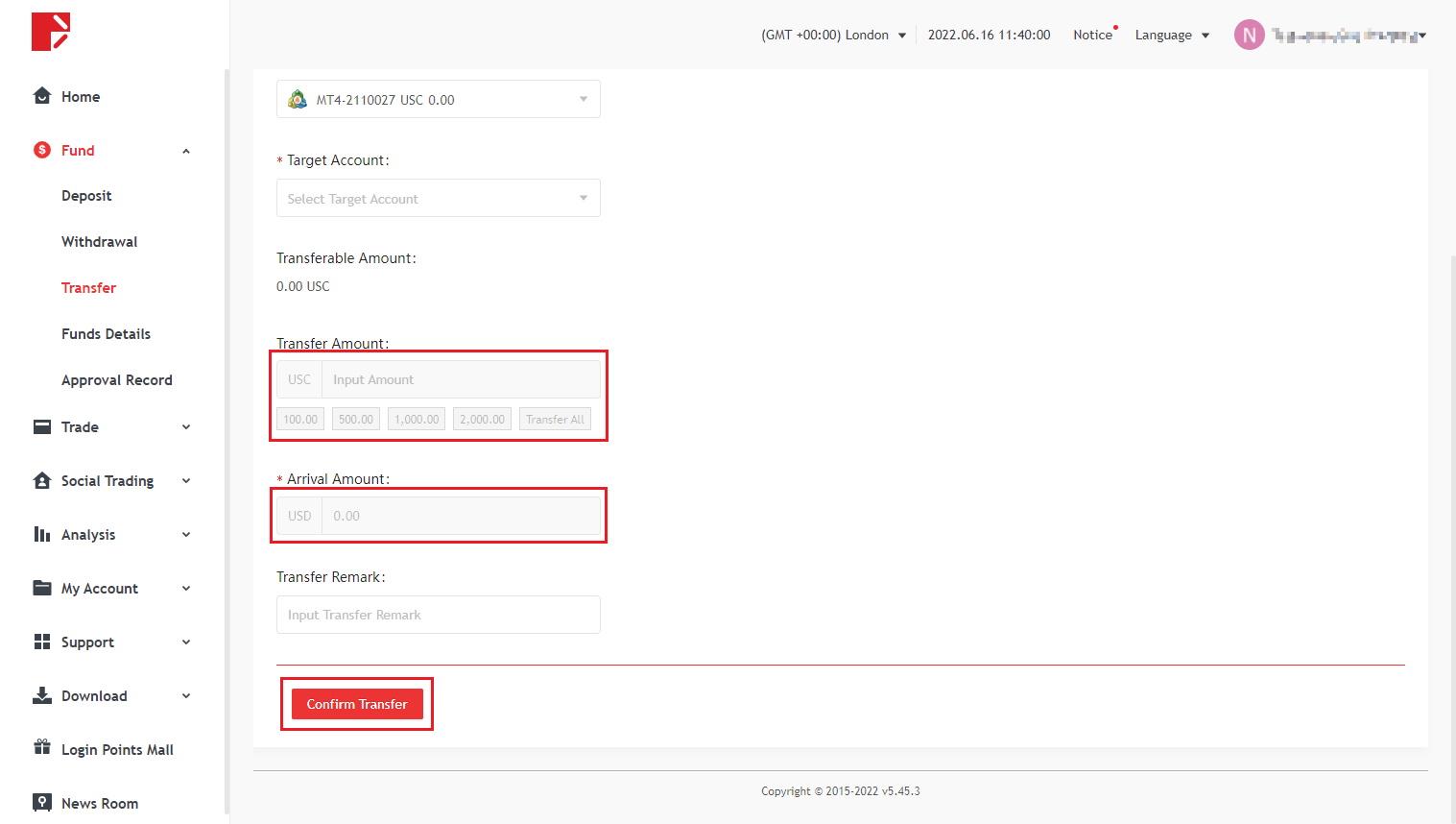 Selecione a conta de transferência, insira a conta de transferência e o valor da transferência. Para verificação de segurança via celular ou e-mail, clique em "Enviar código de verificação" e insira o código de verificação. Por fim, clique em Confirmar Transferência.