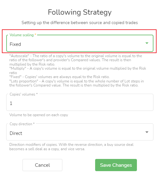 O volume da cópia comercial depende do saldo atual ou patrimônio da conta do seguidor. Os seguidores podem ajustar o volume de negociação de cópias de acordo com o saldo atual da conta ou valor líquido para controlar o risco de cópia