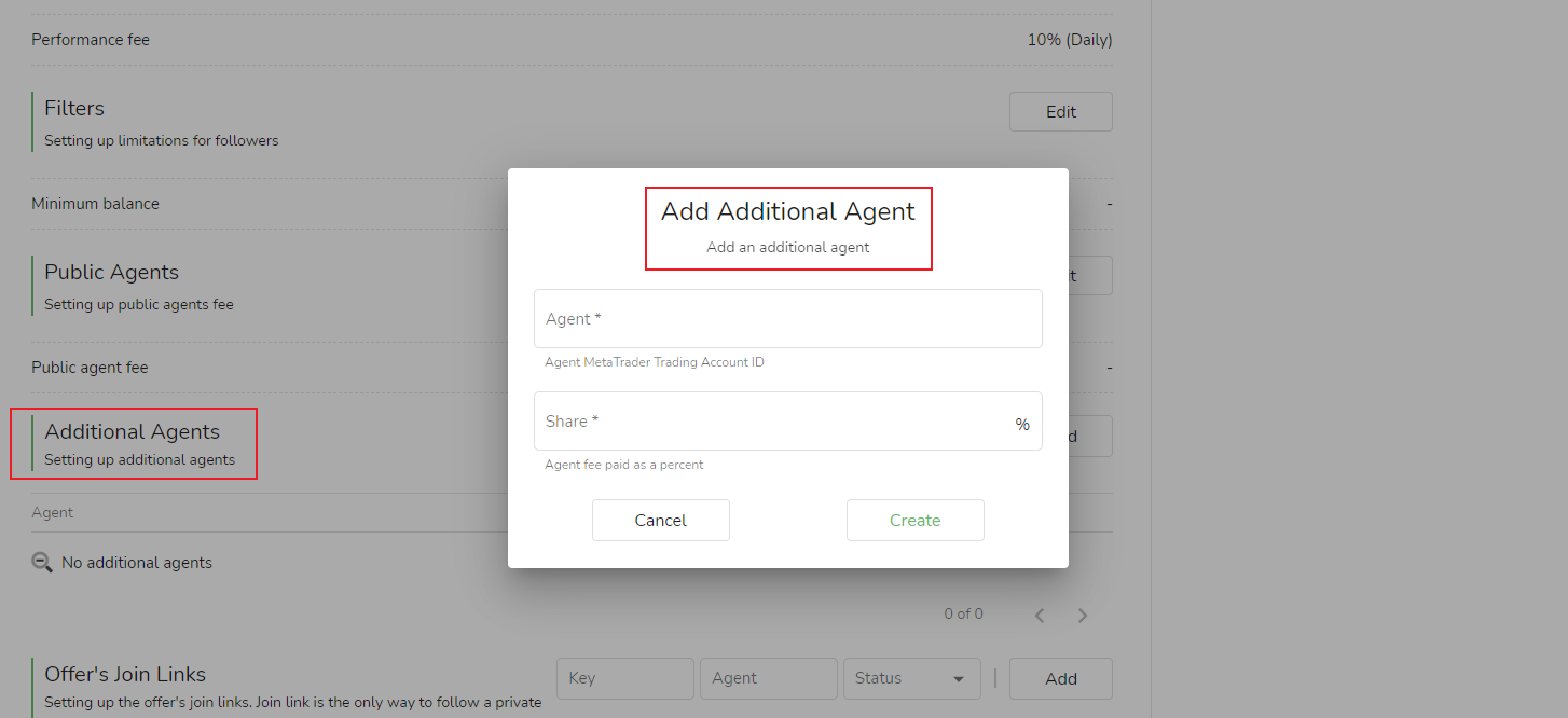 Parceiros de fonte de sinal:Comparado com a introdução e promoção, o parceiro de fonte de sinal tem um relacionamento mais próximo com a fonte de sinal. A fonte de sinal pode ser adicionada clicando em [Adicionar], preenchendo a conta de negociação MetaTrader do parceiro de fonte de sinal, definindo a taxa de parceiro de fonte de sinal por uma porcentagem e clicando em [Criar] para adicionar o parceiro de fonte de sinal.