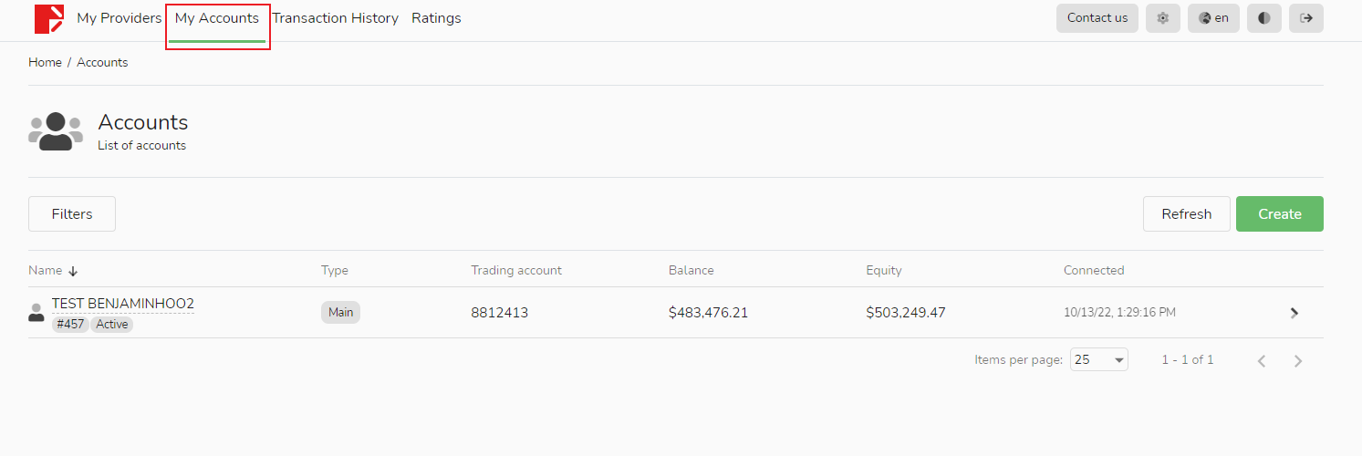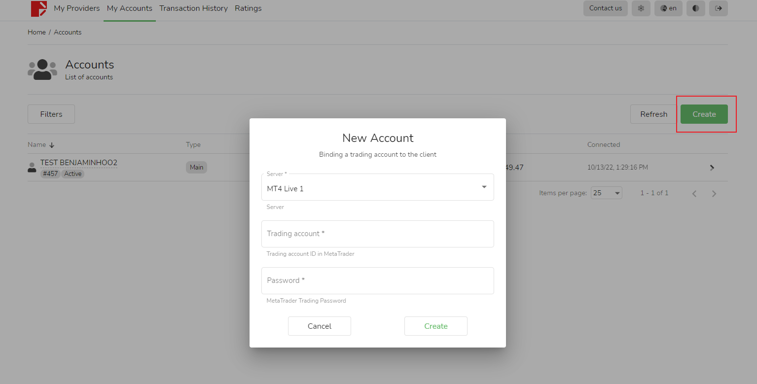 Na página [Minha conta] da fonte do sinal, você pode adicionar uma nova conta de negociação clicando no botão verde [Criar]. No entanto, esta conta não pode ser usada para fazer login e só pode ser selecionada como fonte de sinal, seguidora ou configurada para receber taxas de desempenho.