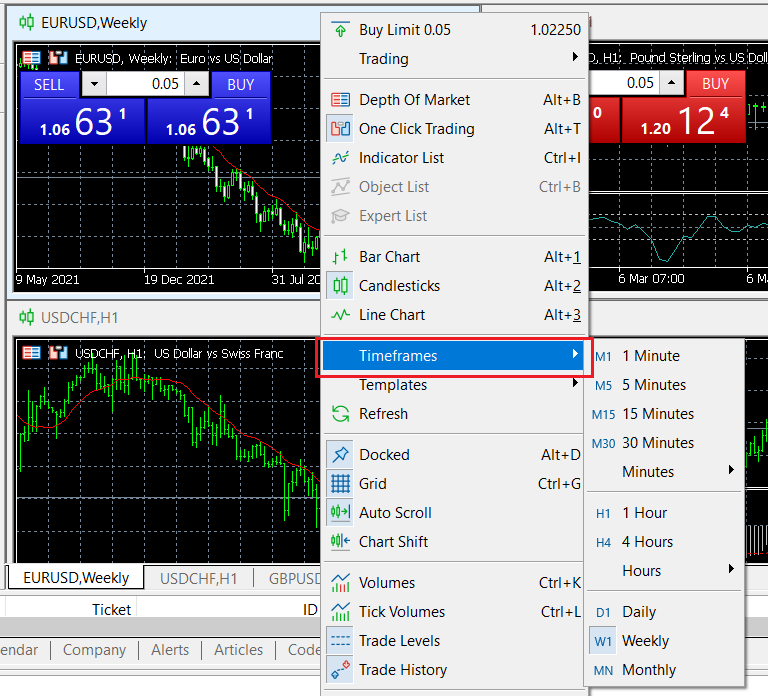 Clique com o botão direito do mouse em [Gráfico] na barra de menu do MT5 e selecione [Período] para visualizar todos os períodos de tempo que podem ser selecionados no MT5.