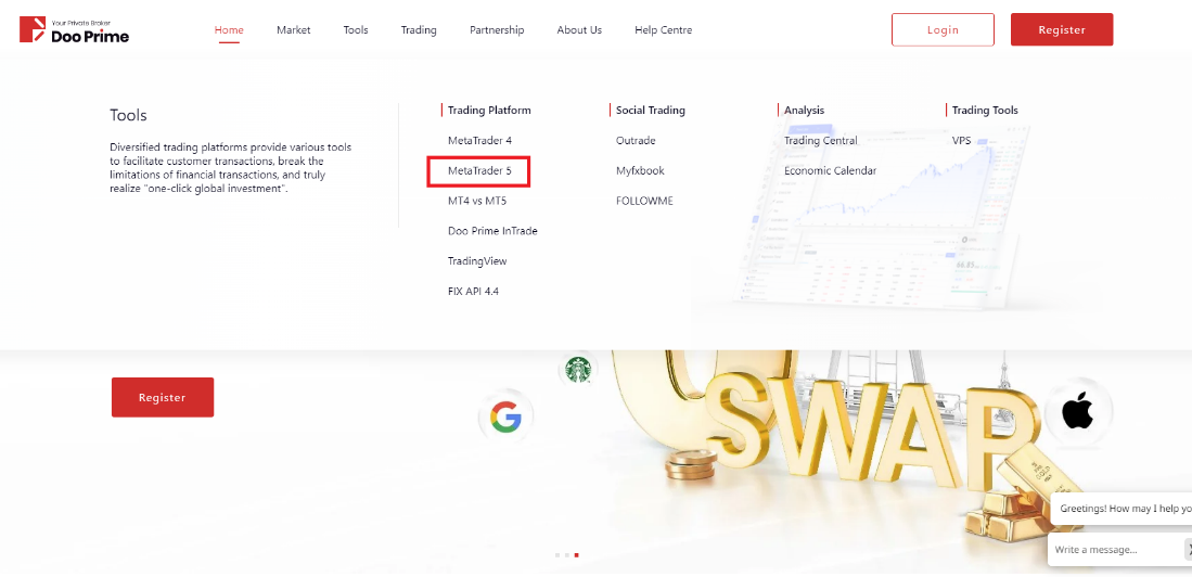 Depois de fazer login, você pode selecionar [Software de negociação] em [Trade] no menu à esquerda e, em seguida, selecionar a porta correspondente no ícone [MetaTrader 5].