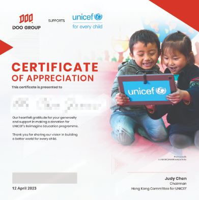 - 客戶最低捐款額為100夢想值,客戶累積捐贈滿3,000夢想值,則可獲得由聯合國兒童基金會(UNICEF)頒發的官方感謝狀。
