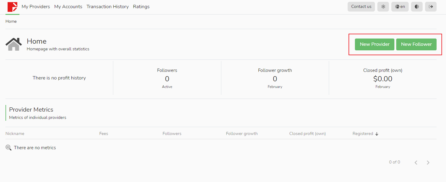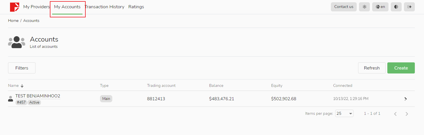 Trên trang [Tài khoản của tôi] của người theo dõi, bạn có thể thêm tài khoản giao dịch mới bằng cách nhấp vào nút [Tạo] màu lục. Tuy nhiên, tài khoản này không thể được sử dụng để đăng nhập và chỉ có thể được chọn làm nguồn tín hiệu, người theo dõi hoặc thiết lập để nhận phí hiệu suất.