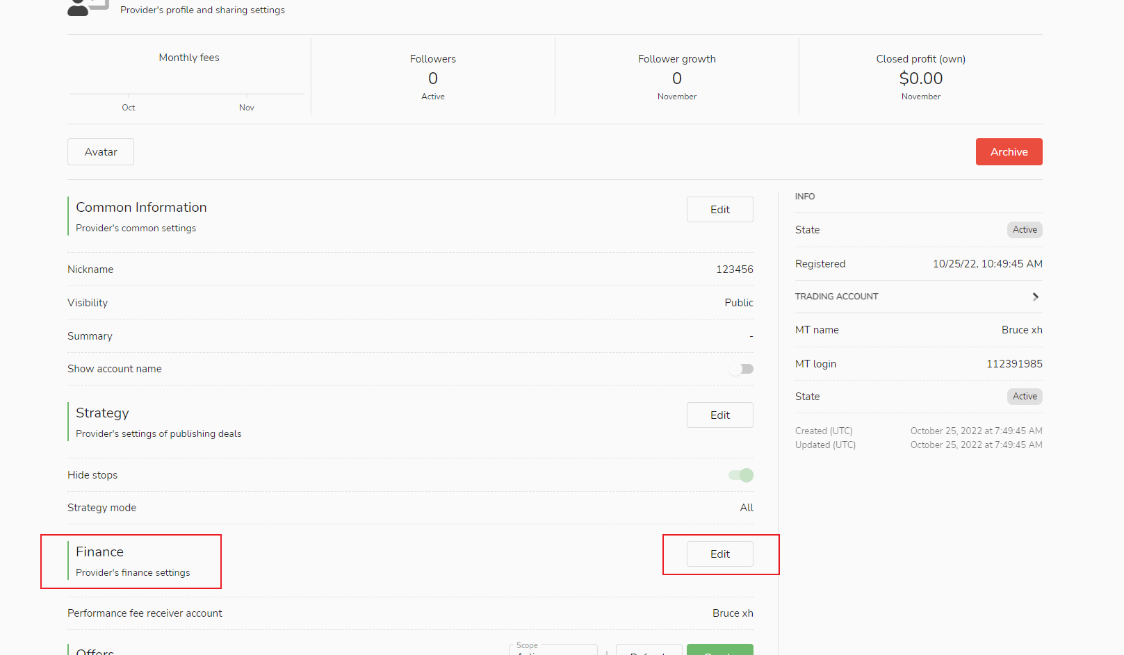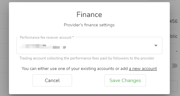 - Trong cột "Nguồn tín hiệu của tôi", chọn "Cài đặt tài khoản người nhận phí hiệu suất" và nhấp vào nút "Chỉnh sửa".